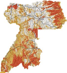 The QGIS GRASS plugin was used to import 5 meter contours of the whole region into GRASS which were then converted into a contour raster map using r.surf.contour. A slope and aspect map were then generated using r.slope.aspect from the raster contour map. Categories were assigned to different slope and aspect ranges and given a hazard risk sore. Vegetation areas were also given different risk scores. All the resulting raster maps were then combined using mapcalc and given a final risk hazard score. The risk scores are then divided into three main categories: high; medium; and low.