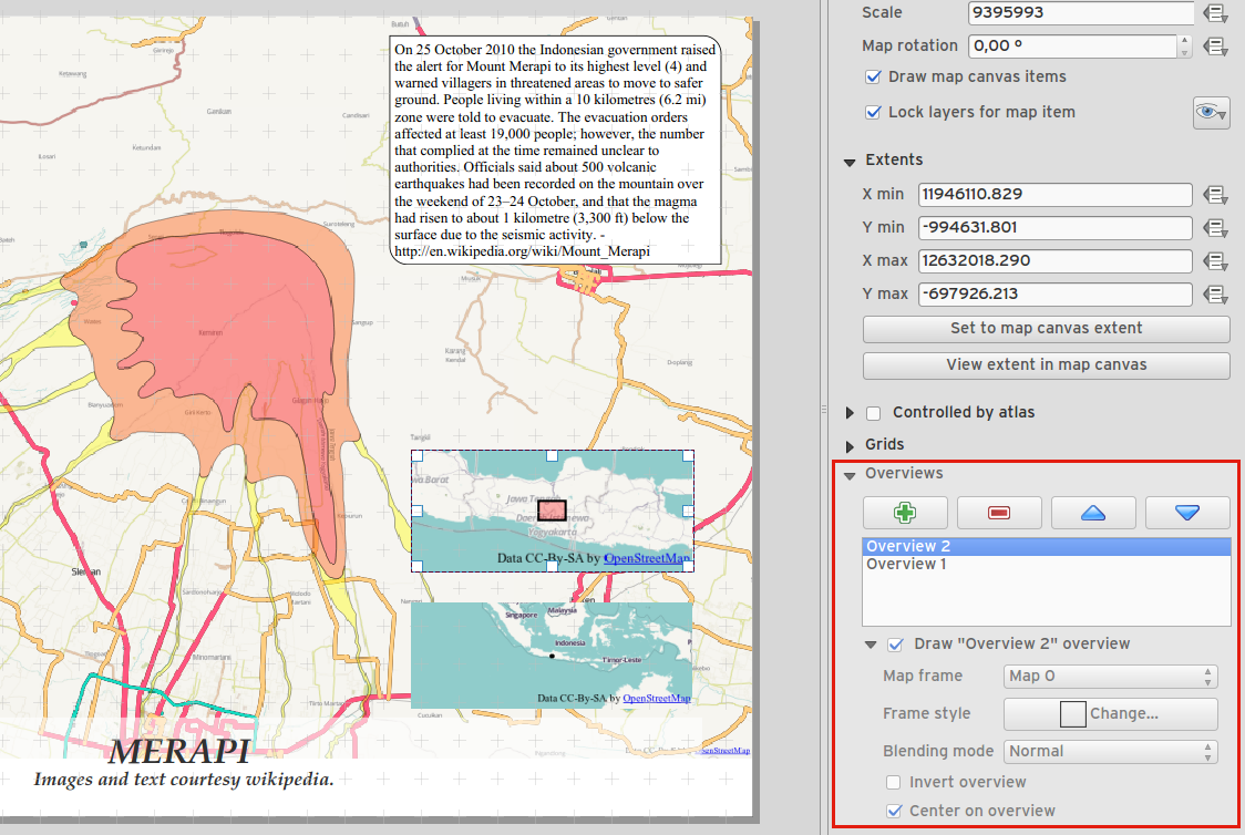 Sometimes it is useful to be able to show more than one overview frame for a map frame. For example if you want to show where your map is in local, regional and global context, using multiple overview maps can help you to achieve this. As of QGIS 2.6 you can now achieve this by assigning as many maps as you like to the 'overview' role in your composition.