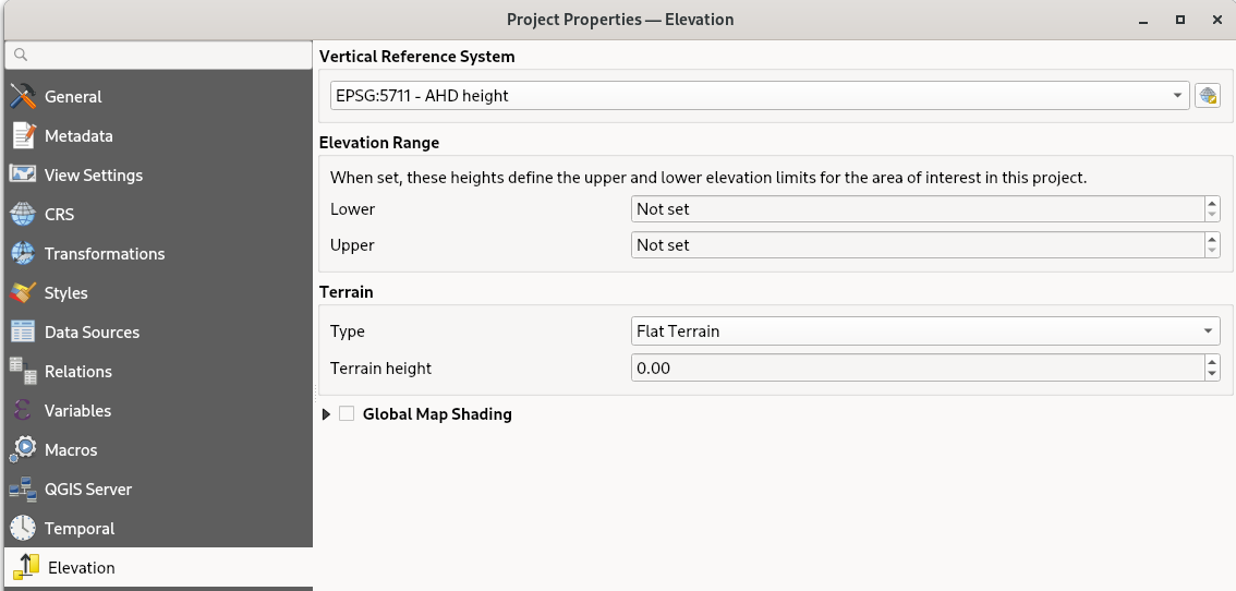 Various improvements have been provided for elevation management, including the new elevation controller as well as the ability to explicitly declare a vertical CRS for your project. Previous releases actively removed vertical CRS information for technical reasons, as outlined in QGIS Enhancement Proposal 267, however, this vital aspect of spatial data management is now being reintroduced to the QGIS project.