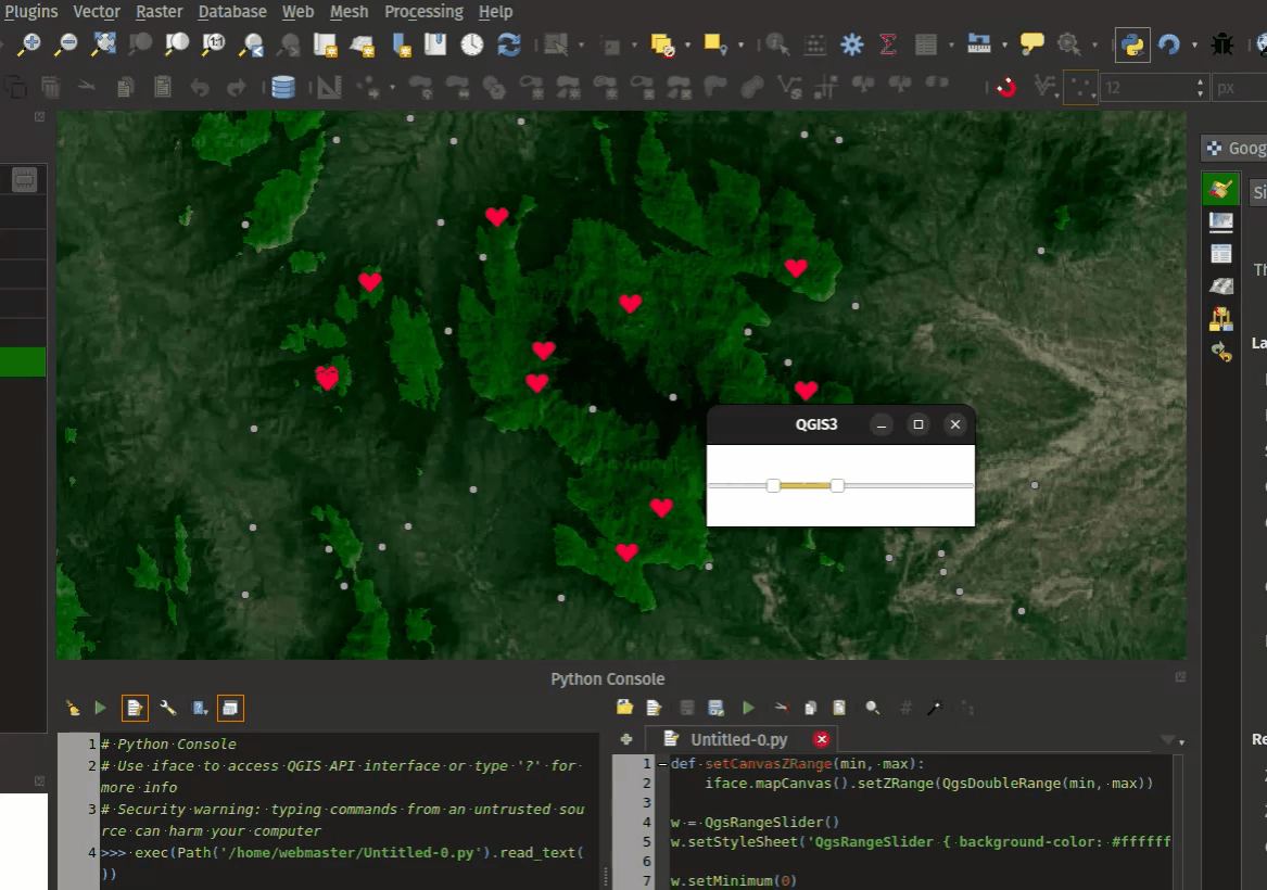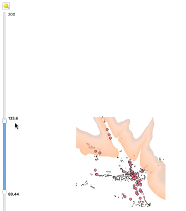 The controller shows as a range slider on the left of the map. There’s a configure action for setting the project’s elevation range, which dictates the range available from the widget.