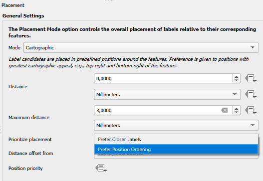 When the layer is set to the “cartographic” mode, then the default behavior is also to prioritize closer labels. A new combo box allows users to control the priority, with an option for preferring position ordering. If this option is set, candidates at the corresponding positions (e.g. top left) are preferred, regardless of how far they are from the point, with the labeling falling back to alternate positions only when no labels can be placed up to the maximum label distance.