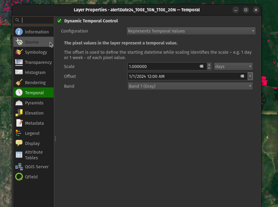 A new temporal mode for raster layers is provided that interprets each pixel as a datetime value.