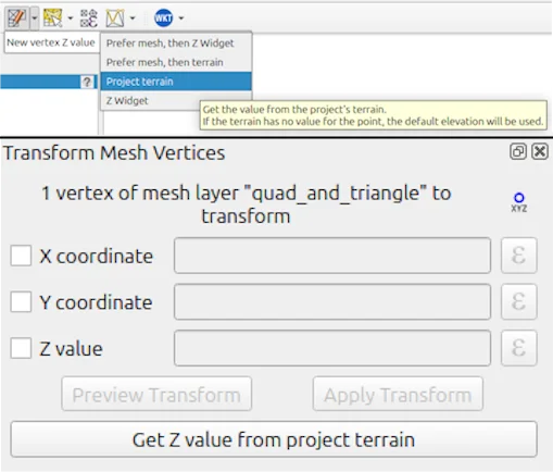 The “Transform Mesh Vertices” panel also has a new button added that allows users to set the Z value of selected vertices from inferred values based on the project terrain settings.