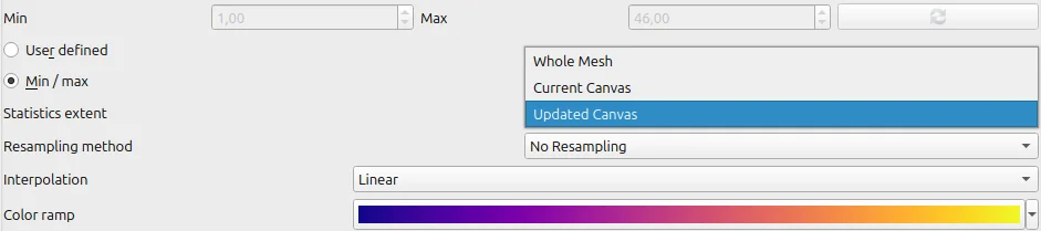The renderer setting for Mesh now includes an option for setting the Min/Max limits of the Color Ramp renderer based on the current canvas extent. This can be locked to a specific canvas instance or changed based on the active canvas using the same rendering behaviors as Raster Layers.