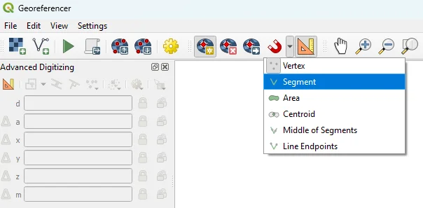 The advanced digitizing panel and snapping options have been added to the georeferencer interface to offer users more control over reference points when aligning datasets.